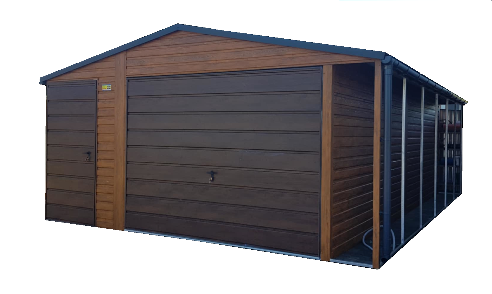 Garaż blaszany 4x6m z bramą uchylną oraz wiatą- złoty dąb jasny + orzech