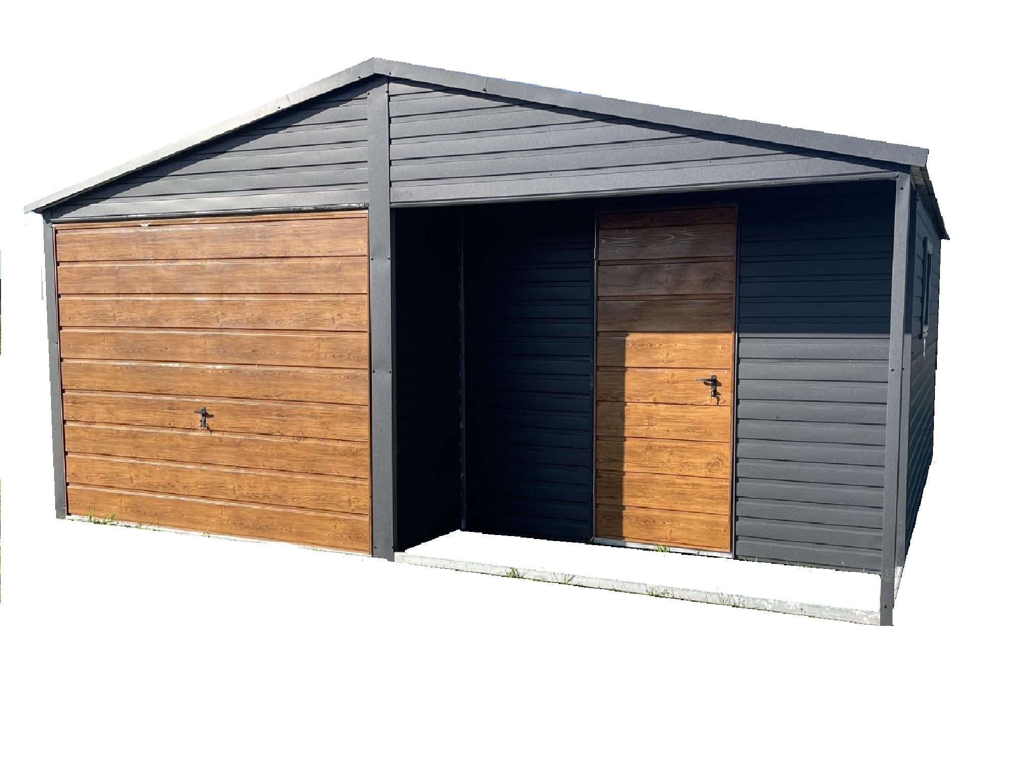 Szukasz stylowego i funkcjonalnego garażu blaszanego z wiatą, bramą uchylną i drzwiami?