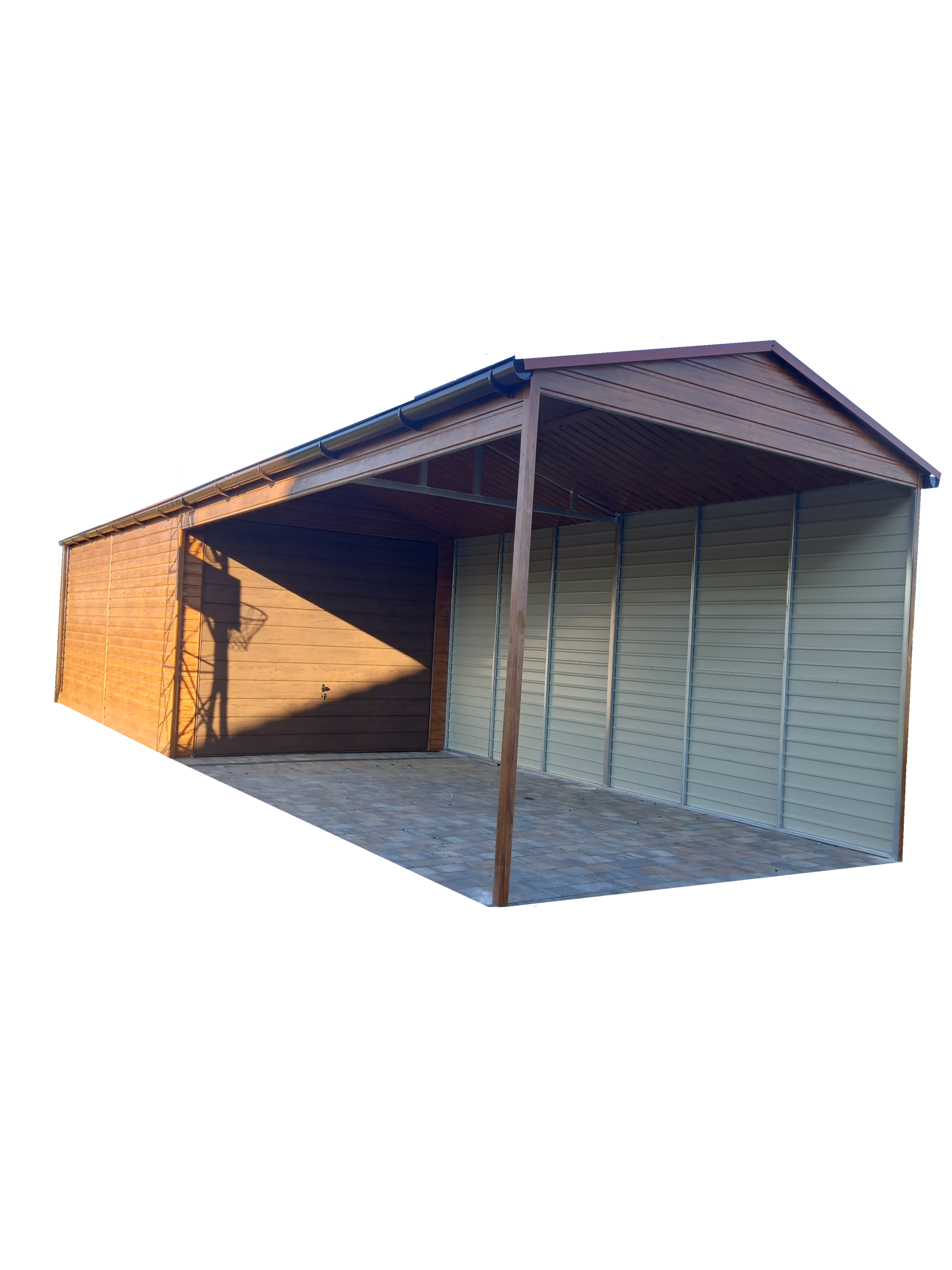 Szukasz stylowego i funkcjonalnego garażu blaszanego z dodatkową wiatą z przodu?