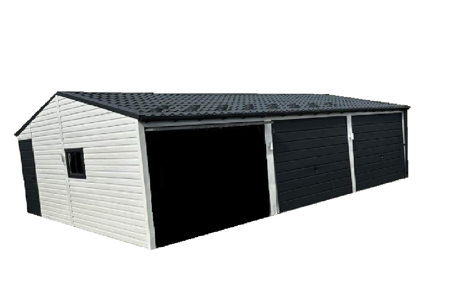 Garaż blaszany 9x5m z trzema bramami uchylnymi – biały + antracyt
